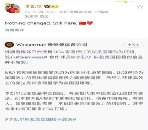 李凯尔及其经纪公司沃瑟曼体育公司于2025年12月24日发布声明:否认李凯尔恢复美国国籍的传闻。