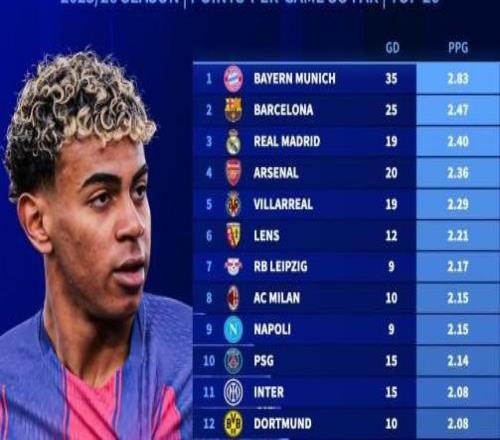 本赛季五大联赛场均积分前20:拜仁、巴萨、皇马、阿森纳前4